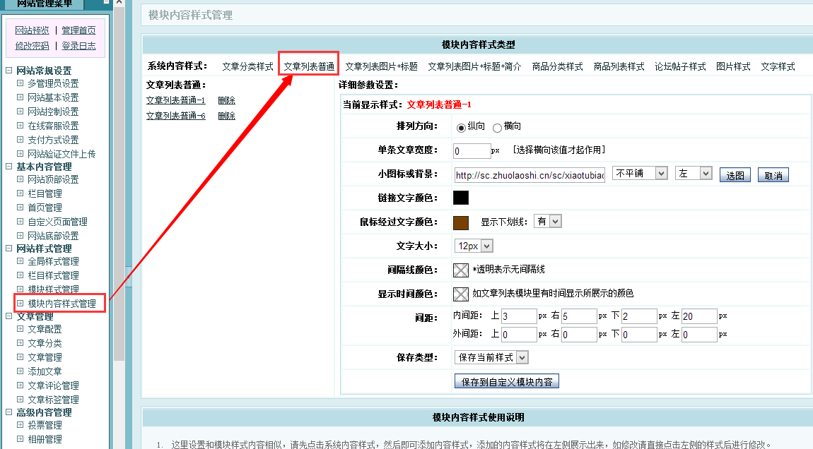 步骤一:登陆网站后台》网站样式管理》模块内容样式管理文章列表普通