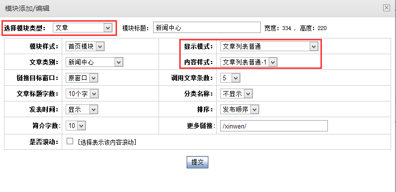 步骤二:到首页管理中添加新模块,模块类型选择文章,显示模式选择文章列表普通,内容样式选择我们刚刚添加或设置的那个样式,其他内容根据您的个人需求设置即可