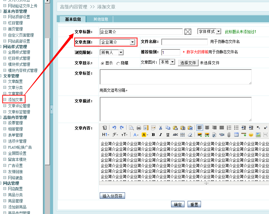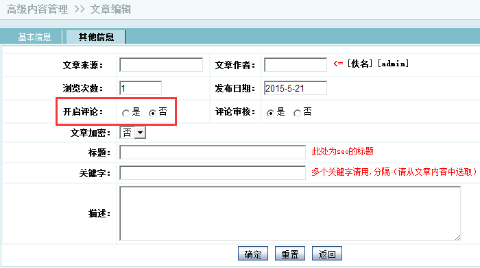 设置好以上步骤后,到文章管理中添加一篇文章,文章类别选择新添加的企业简介中,企业简介这个页面肯定是不会让别人评论的,在其他信息中将开启评论设置为否,确定提交即可