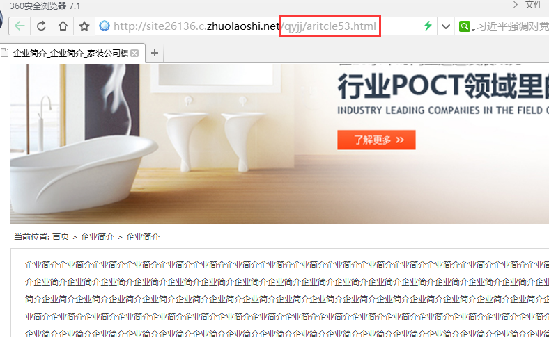 首先,我们打开企业简介这篇文章,然后复制到地址栏中复制网址(注意:这里只复制域名后边的相对路径即可,)如,我们的这个页面,只复制/qyjj/aritcle53.html即可