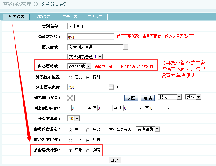 添加好之后点击企业简介后的修改设置,将文章标题设置为隐藏,如果左侧不想显示任何模块,可以将显示模式设置为单栏模式