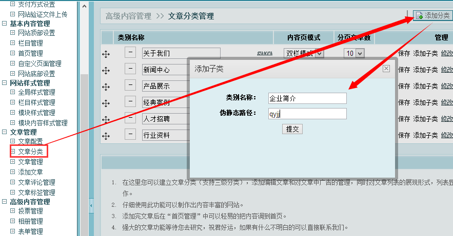 首先在文章管理》文章分类中新建一个分类,可以随意命名,这里设置为企业简介,伪静态路径建议使用名称的拼音首字母,方便记忆
