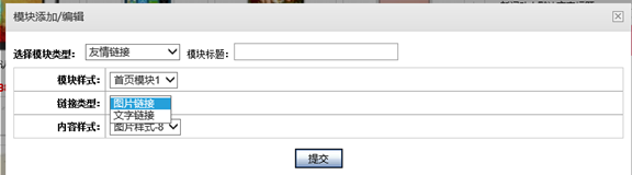 首页要添加一个友情链接模块,添加时选择模块类型为友情链接,填写好模块标题,选择好是文字链接或者是图片链接(添加图片链接时图片要上传到网络硬盘中哦!),及模块样式、内容样式,如图所示: