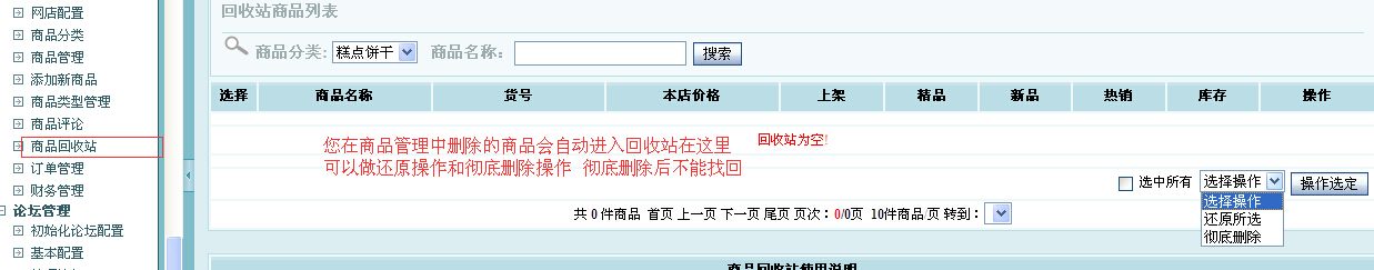 商品回收站: 您可以对回收站的商品进行还原和彻底删除,
