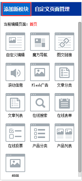 在手机管理面板左侧》添加新模块,选择需要添加的模块类型
