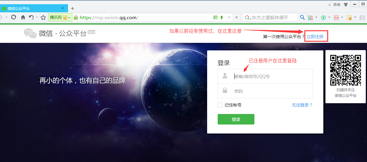 在使用之前我们需要先登陆微信公众平台去申请一个公众号,https://mp.weixin.qq.com/,根据您的需求可以申请订阅号或服务号,类型不同,功能不同,详细可以到微信平台官网了解